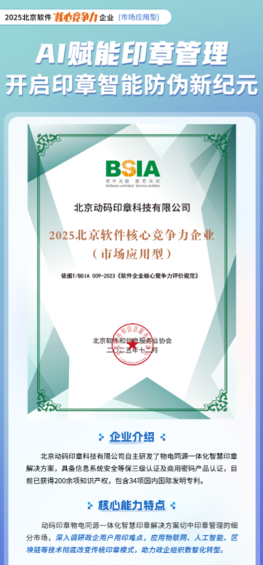 北京软件和信息服务业协会(以下简称“北京软协”)在第十一届会员代表大会第三次会议暨2025企业服务年会上正式发布《2025北京软件企业核心竞争力评价报告》。报告旨在发现当前产业亮点,发展企业核心能力,发掘未来创新引擎。为进一步推动企业建设核心能力、拓展市场、提升品牌影响力,协会对获得“2025北京软件核心竞争力企业(市场应用型)”企业——动码印章核心能力成果进行了展播。