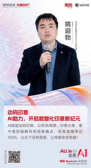 用友YonSuite分论坛上,动码印章售前交付中心总经理姚迎勃发表了题为《动码印章 AI助力开启数智化印章新纪元》的主题演讲,他深入分析了企业数智化转型过程中印章管理存在的核心痛点,并阐述了动码印章防伪溯源能力及智能化用章管理模式,AI技术在行业印章管理突破性应用。