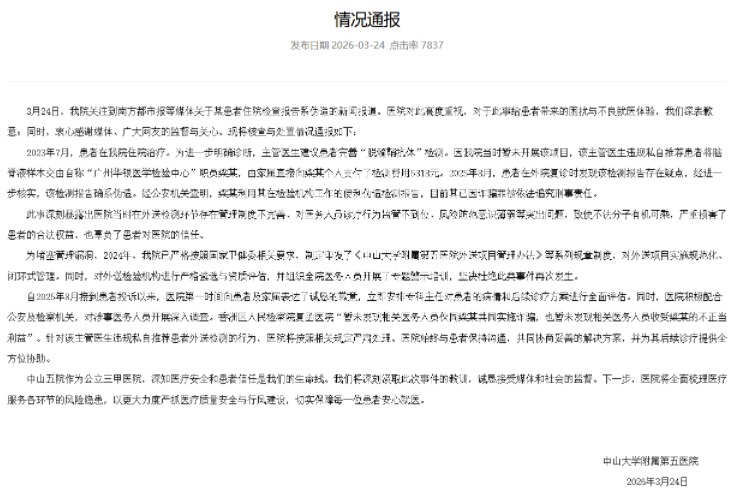 近日,中山大学附属第五医院(简称“中山五院”)发布情况通报,就“患者住院检查报告系伪造”一事发布通报称,经进一步核实,该检测报告确系伪造,针对该主管医生违规私自推荐患者外送检测的行为,医院将按照相关规定严肃处理。